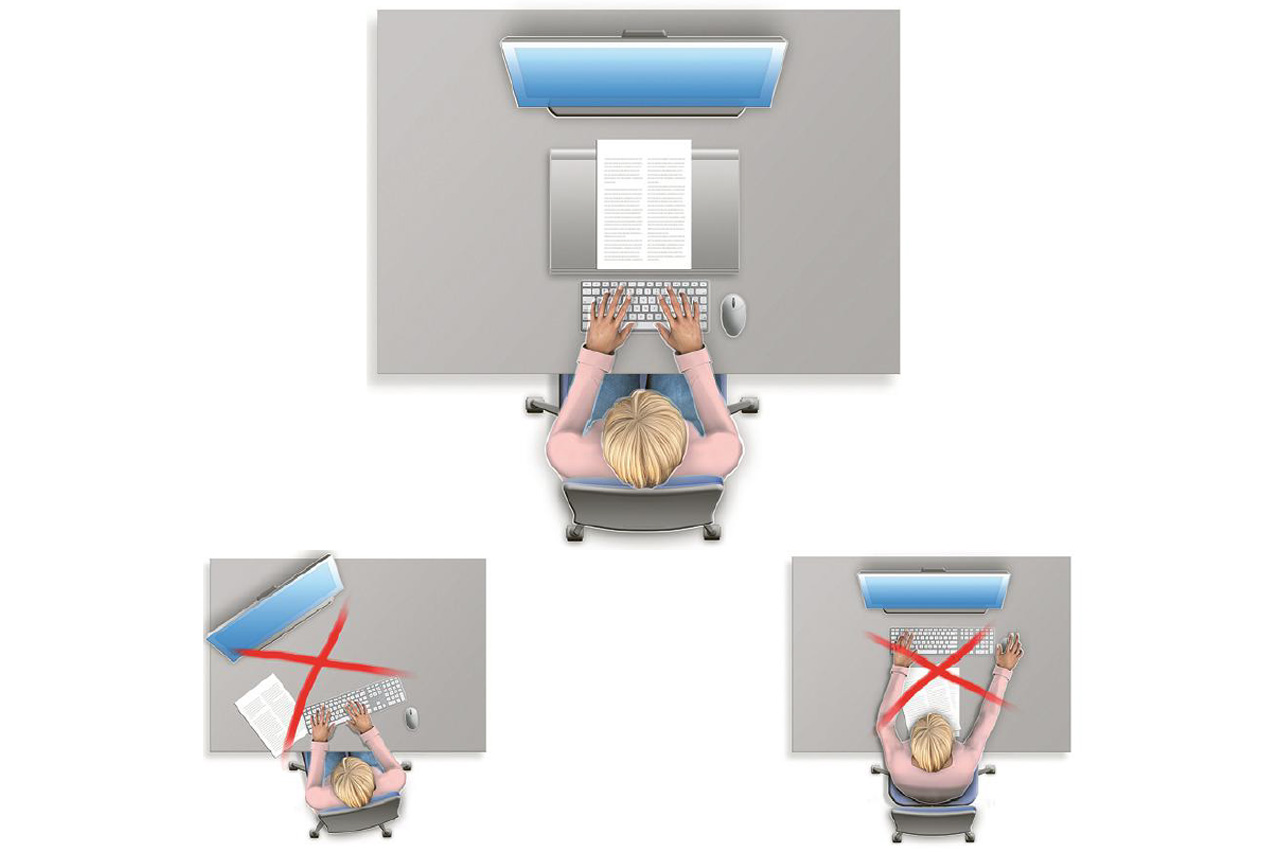 Diese Tätigkeiten verlangen bestimmte Haltungen des Oberkörpers, des Kopfes, des Schultergürtels, der Arme und der Hände, sowie der Beine, mit welchen die notwendigen Bewegungen dieser Körperteile stattfinden. Benutze werden spezifische Arbeits- oder Betriebsmittel eines Bildschirmarbeitsplatzes wie einen Computer mit Bildschirm, ein Telefon, diverse Eingabegeräte, so die Tastatur, die Maus und vielleicht ein Scanner und Ausgabegeräte z.B. ein Drucker. Alles findet unter Benutzung eines Bürotisches und Bürostuhles statt.