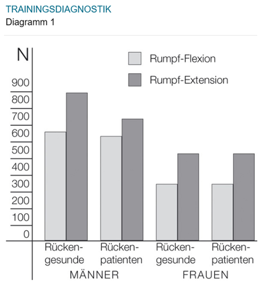 Zwischen Extensoren und Flexoren besteht eine Korrelation. Rumpf-Extensoren zeigen sich beim Gesunden kräftiger als die Flexoren. Rückenpatienten zeichnen sich durch eine signifikant geringere Maximalkraft der Rumpf-Extensoren im Verhältnis zu Rückengesunden aus. Nach einem Therapieverlauf von 5 –10 Trainingseinheiten wurden deutlich höhere Kraftwerte der Rückenmuskulatur erfasst.