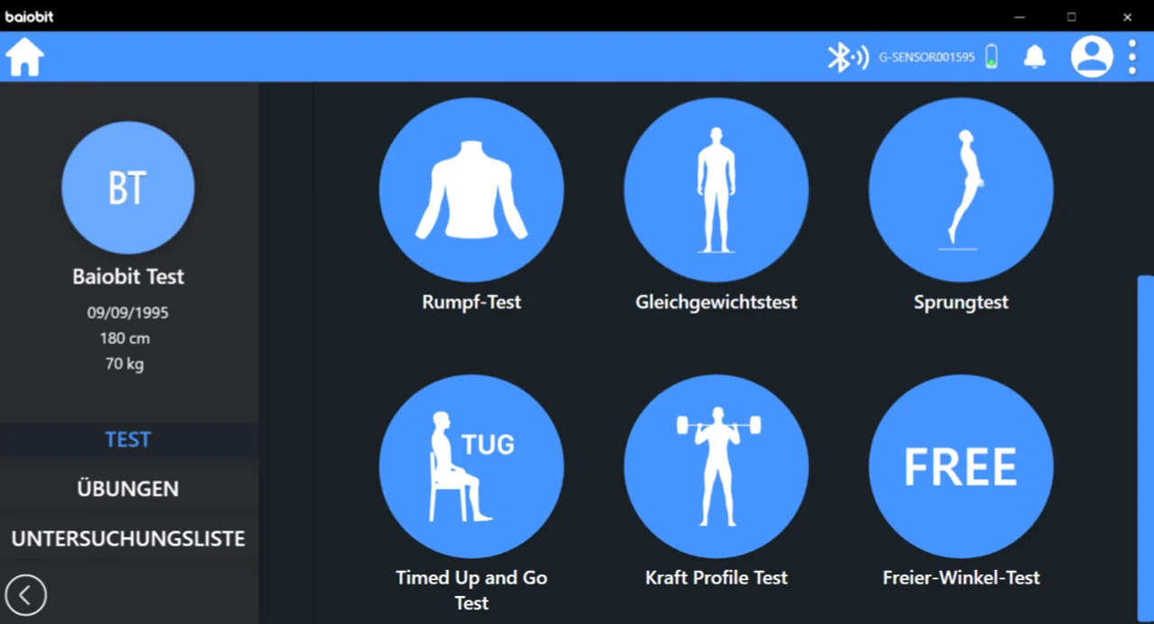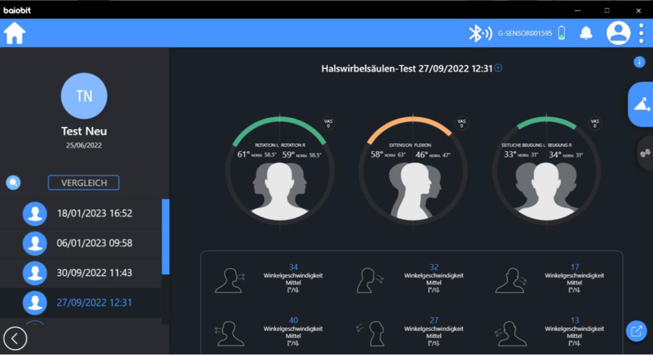 Wie man der Menü Übersicht entnehmen kann, ist der Gehtest des G-Walk in dieser Plattform integriert. Zusätzlich sind Beweglichkeitsmessungen der Halswirbelsäule, der Schulter und des Rumpfes möglich.
