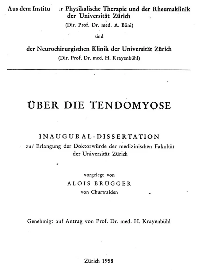 Im Jahre 1958 promovierte A. Brügger mit seiner Dissertation “Über die Tendomyose” zum Doktor der Medizin.