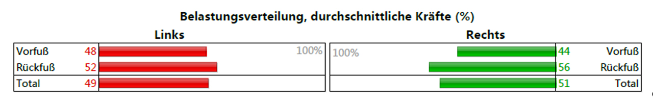 Bei der Standanalyse wird die Belastung links/rechts sowie Vor – und Rückfuss als Zahlenwert und im Balkendiagramm dargestellt.