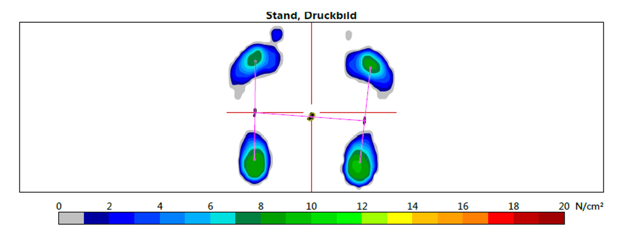 Die Verbindungslinie der Körperschwerpunkte gibt sofort Auskunft über eine asymmetrische Lastverteilung. Die Messdatenaufnahme erfolgt über einen definierten Zeitraum, in dem die Ergebnisse gemittelt werden.