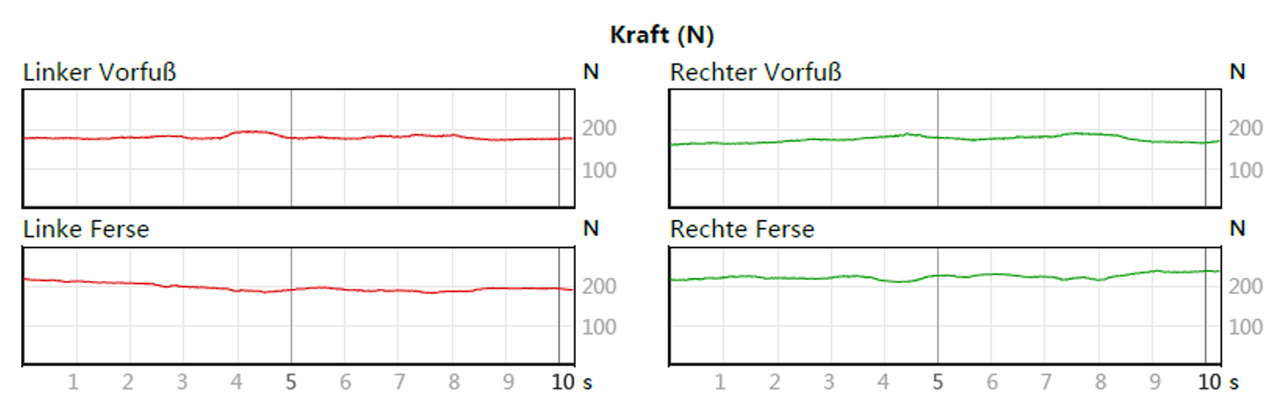 sowie die Belastungsverteilung innerhalb der Füsse und im links – rechts Vergleich aufgezeichnet.