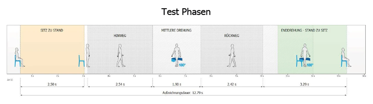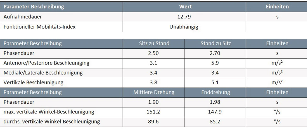 Kürzere Zeiten und grössere Beschleunigungen deuten in der Regel auf eine bessere funktionelle Mobilität und ein gutes Gleichgewicht hin, während längere Zeiten auf Einschränkungen in diesen Bereichen hindeuten können.