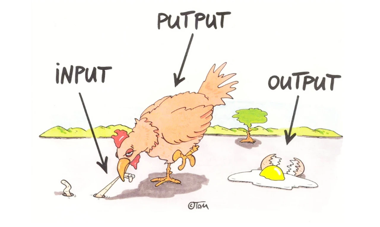 Der Systemgedanke wird mit diesem Cartoon dargestellt. Der Input wird mittels Putput zum gewünschten Output verarbeitet.