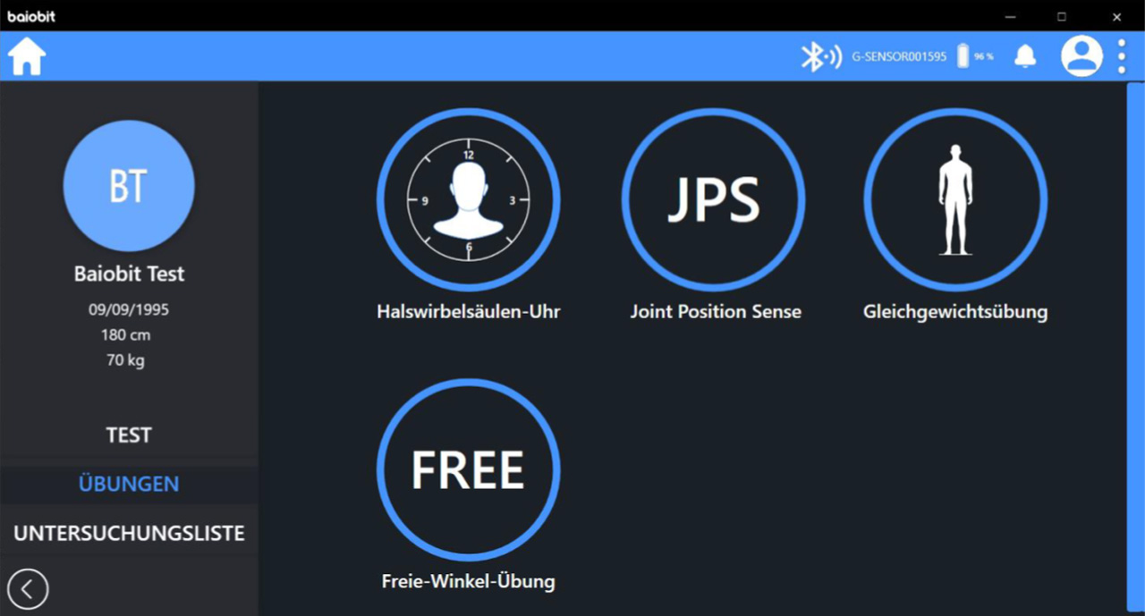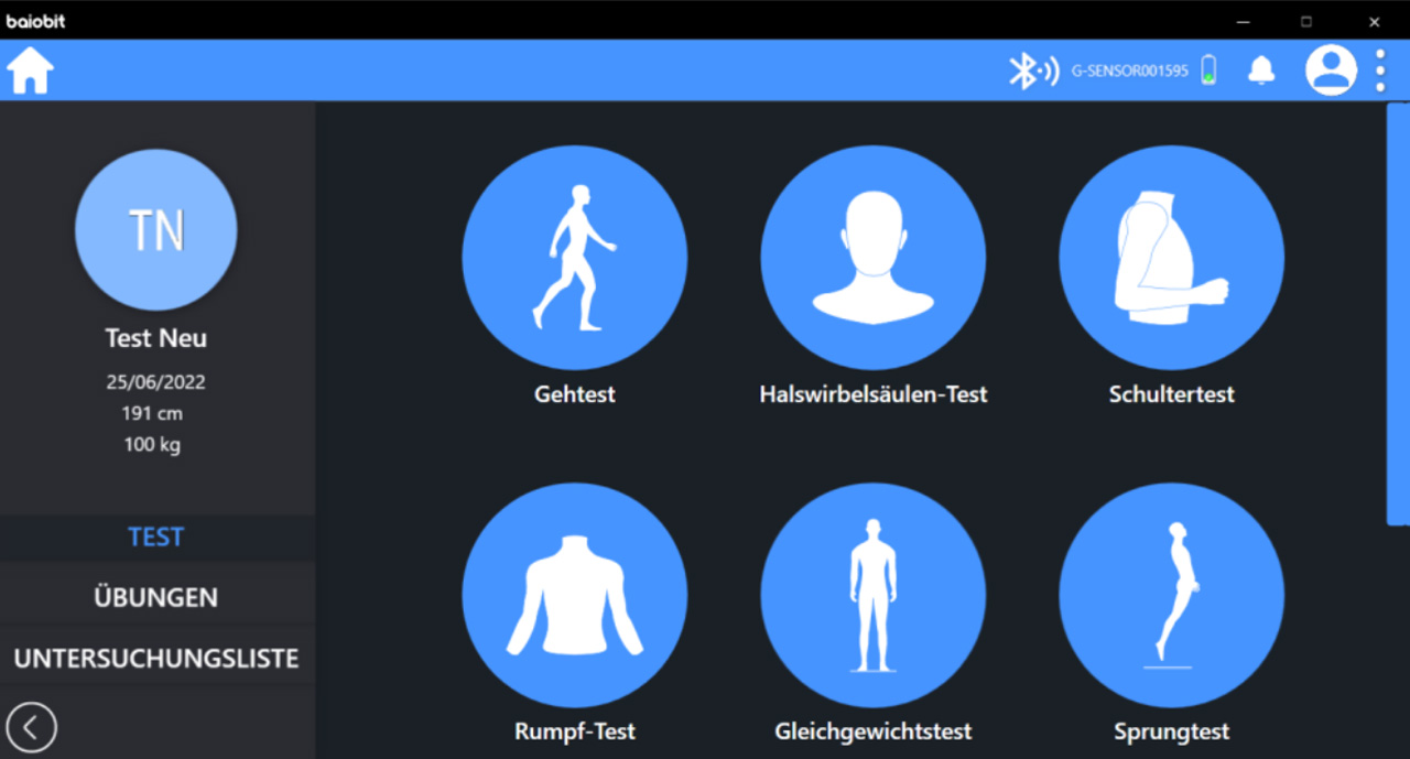 Wie man der Menü Übersicht entnehmen kann, ist der Gehtest des G-Walk in dieser Plattform integriert. Zusätzlich sind Beweglichkeitsmessungen der Halswirbelsäule, der Schulter und des Rumpfes möglich.