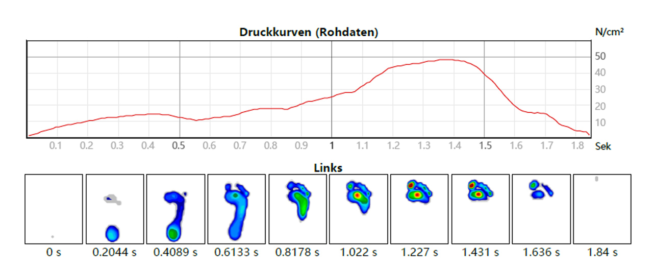 Diese erfasst mithilfe von kapazitiven Drucksensoren die statische und dynamische Druckverteilung unter den Füßen beim Stehen und Gehen.