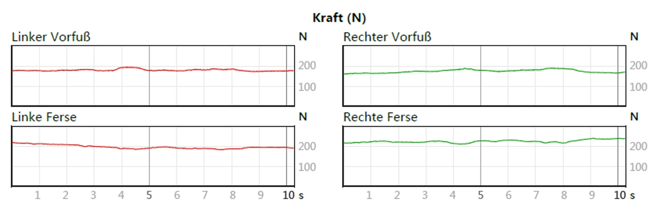 Die Verbindungslinie der Körperschwerpunkte gibt sofort Auskunft über eine asymmetrische Lastverteilung. Die Messdatenaufnahme erfolgt über einen definierten Zeitraum, in dem die Ergebnisse gemittelt werden.