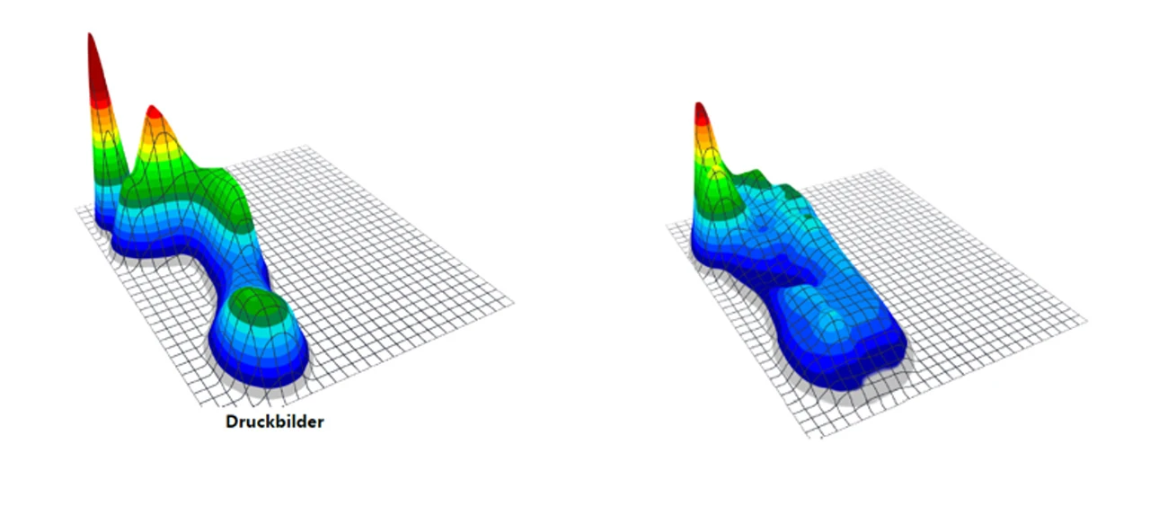 Das Fuss-Druckbild kann dreidimensional dargestellt – und auch als animierte Fussdruck-Messung erfasst werden: