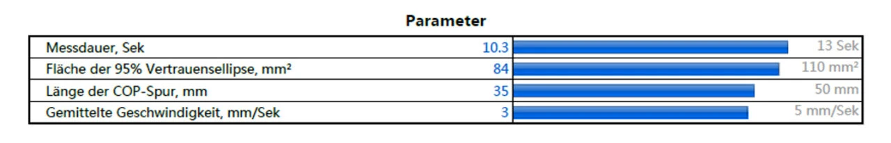 Während der gesamten Messdauer wird zudem die Bewegung des zentralen Druckes, die COP-Spur aufgezeichnet, welche über deren Länge Informationen zur Stabilität liefert